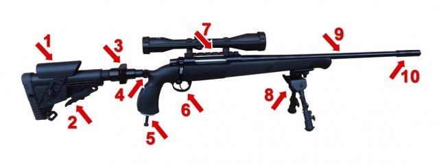 NUOVA SERIE STAR 1) Poggia guancia regolabile, 2) lunghezza calcio regolabile, 3) possibilità di piegare il calcio, 4) possibilita di smontare il calcio, 5) Mono piede posteriore regolabile, 6) Scatto a scelta diretto, tre leve opp. stecher 7) Base ottica o visore, 8) Bipiede regolabile anteriore, 9) canne di vari diametri e lunghezze, 10) Freno di bocca antirinculo..